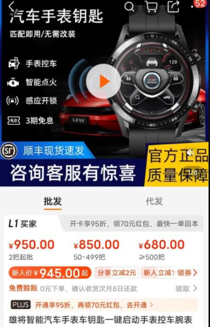 这种带有汽车钥匙芯片的手表,在阿里巴巴看了一下,价格在700-1000元左右,那么一单的利润就到了2000元!