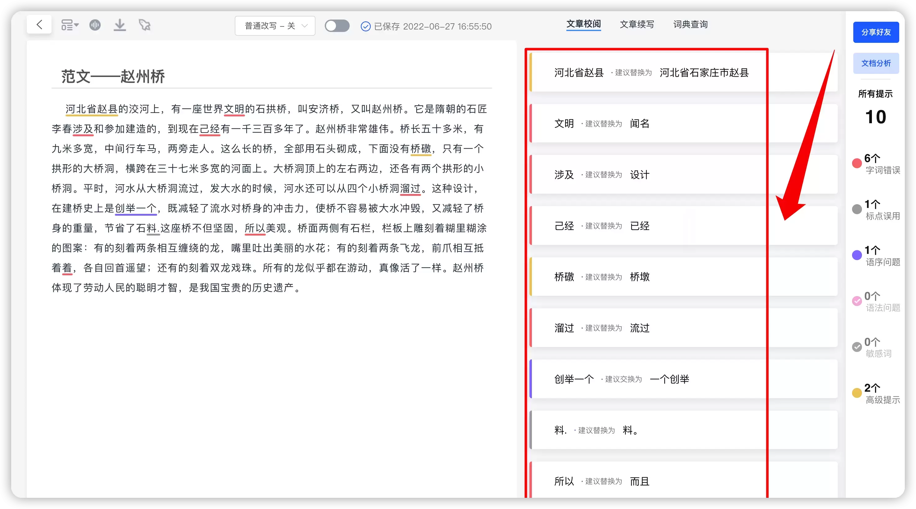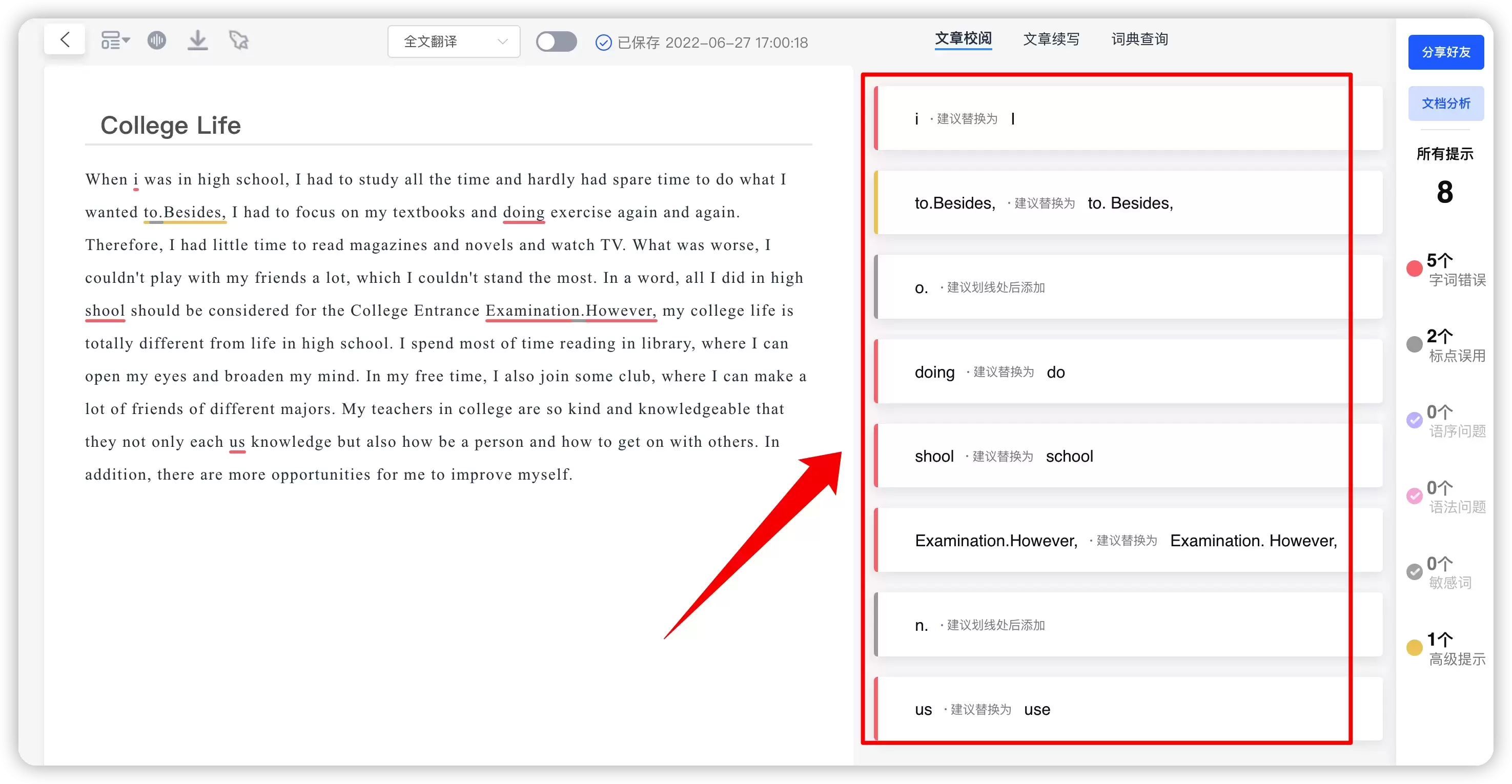 这里就以平台提供的一个范文为例,我们可以看到,平台直接就自动识别了文章存在的错别字,标点符号、语句语法错误等问题。找到错误问题之后,右侧你还可以看到建议修改的词语和句子,识别速度很快,而且准确率很高,相当于直接找了一个免费的高级老师批改作业啊。
