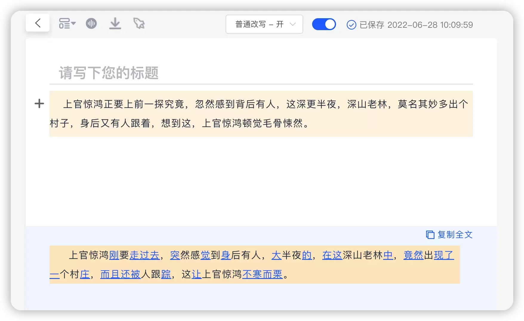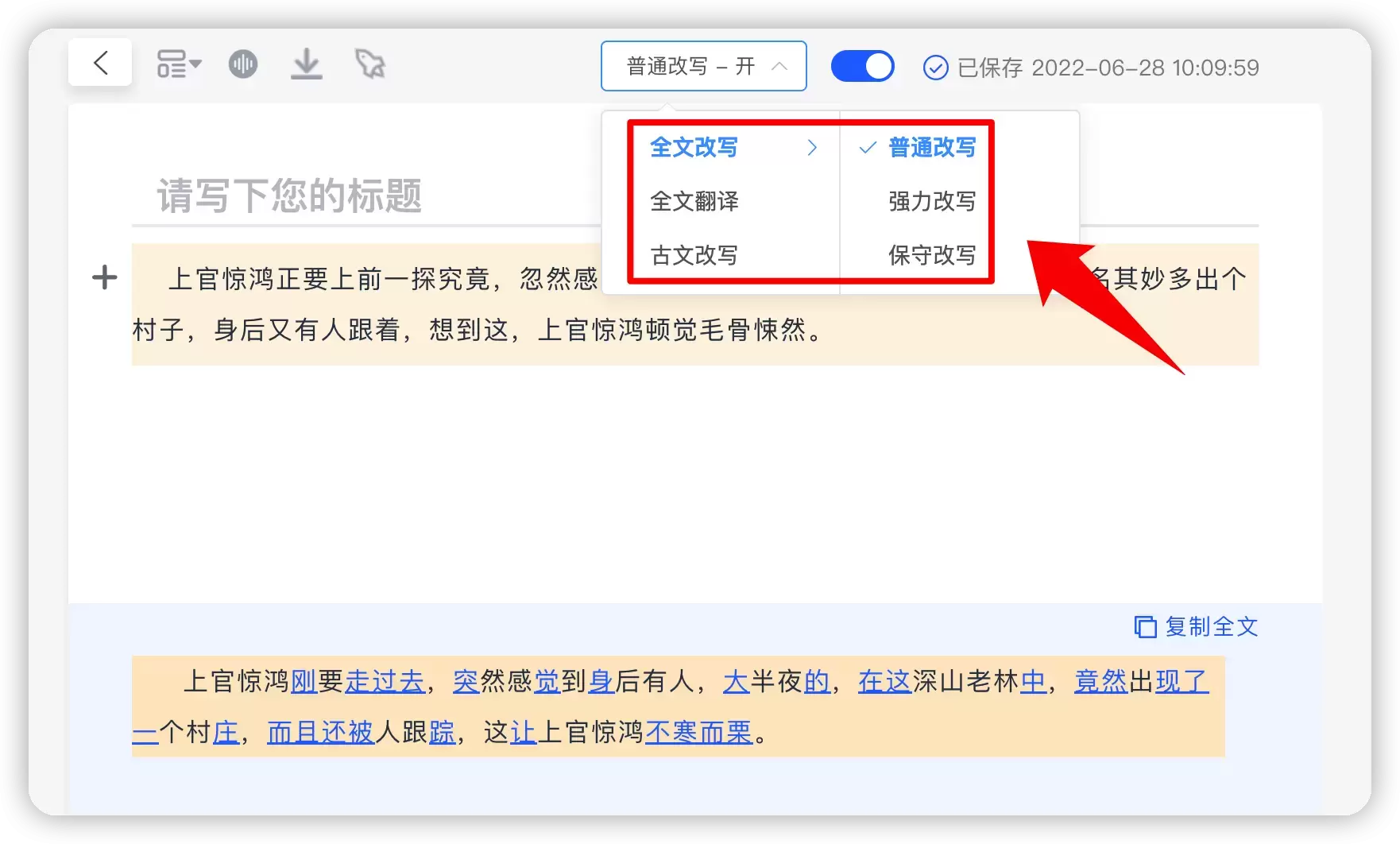 这里我们以一段小说文字为例,你可以选择三种改写模式:普通改写、强力改写、保守改写。改写完成之后,可以直接复制全文使用。