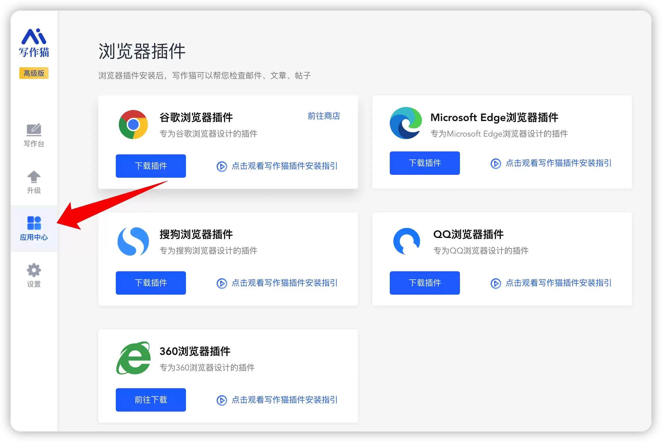 这里我们需要在浏览器安装「写作猫插件」。基本上谷歌内核的浏览器都支持安装的哈,大家可以在官网的应用中心下载。