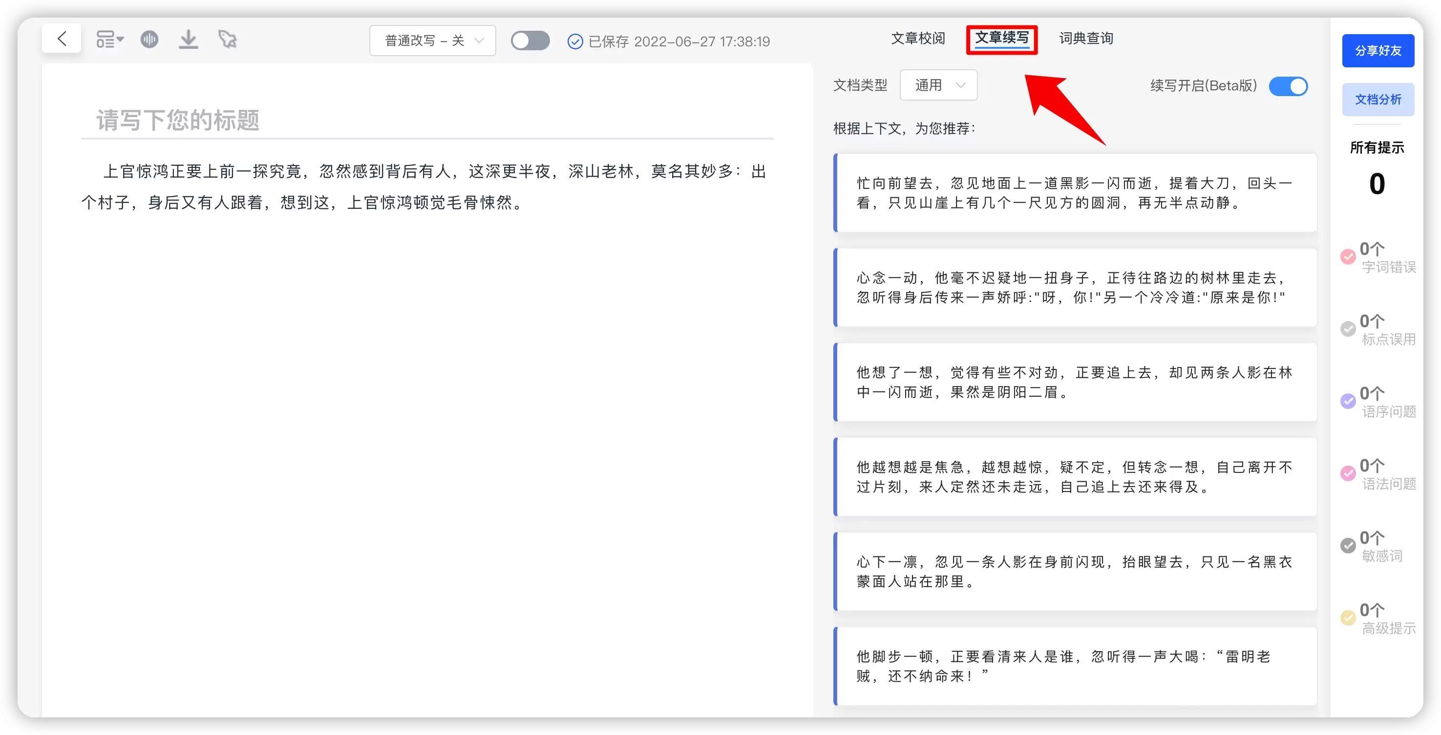 无论是写小说还是写普通文章,都有没有灵感的时候,这时候你不妨使用这个「文章续写」功能,根据上下文给你推荐可写的内容。