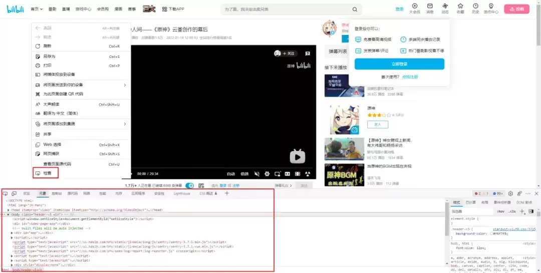 1.在任意浏览器播放视频,鼠标右键选择【检查】或直接快捷键【F12】,打开网页元素审查窗口;