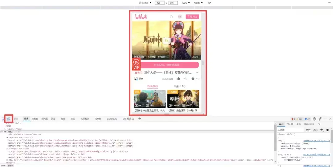 2.点击【仿真设备切换】按钮,将页面切换成移动端页面;