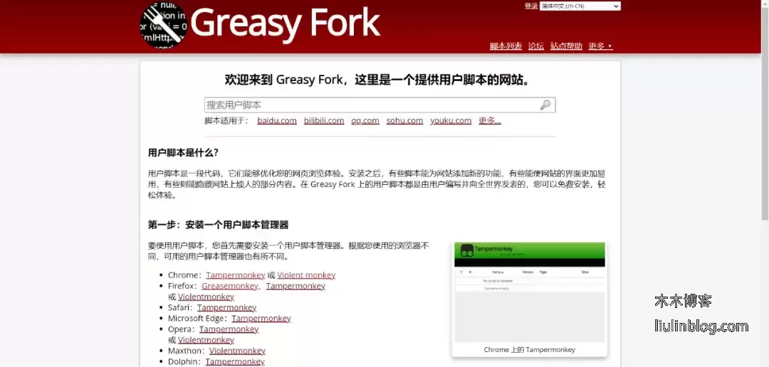 可以看到界面提供了脚本获取地址,一般常用的就是GreasyFork,脚本很全,支持中文搜索。