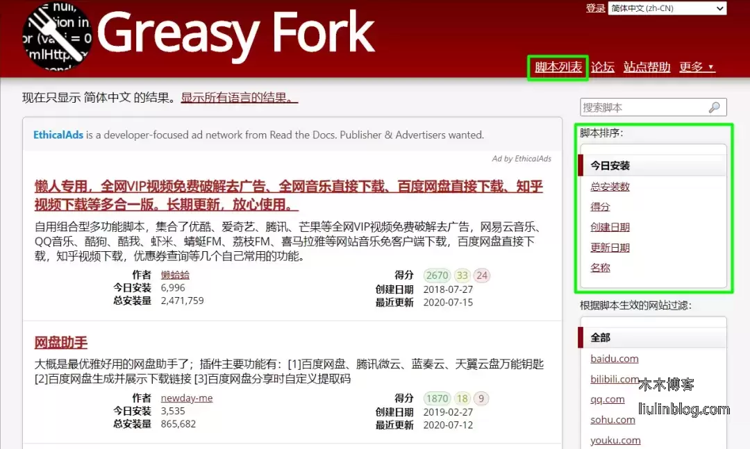 或者可以点击脚本列表,可以按得分或总安装数排名,一般来讲大家都用的脚本肯定是比较好用的。