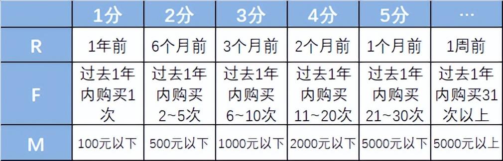 RFM(A)指标可以根据历史销售情况进行制定,如下表: