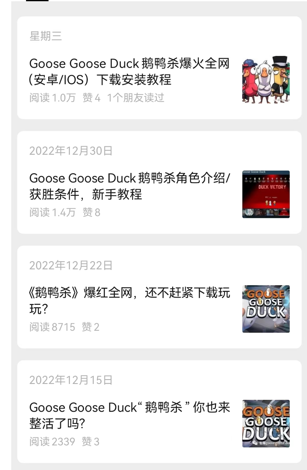 不过在游戏火的时候,能搞钱就速度搞,羊了个羊当时火的时候,有人卖通关教程,单日搞十来万都有,这个鹅鸭杀游戏,同样的玩法,同样的配方,有人借助公众号霸屏,文章霸屏,搞钱。