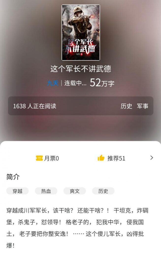3、从男主穿越到九一八前夕的东北军到抗战胜利,全文都是在打仗、打仗、打仗,彻头彻尾的热血军文。看的时候蛮爽,高潮迭起嘛,对于中国军人在抗战中的牺牲精神着墨很多,战壕故事刻画得也挺感人,有时候还能赚点热泪。