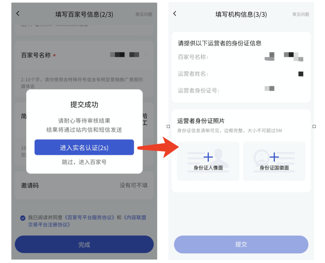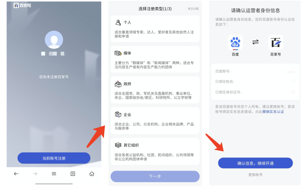 如果你还没开通百家号,点击「当前账号注册」;然后选择「注册类型」,确认「运营者身份信息」。