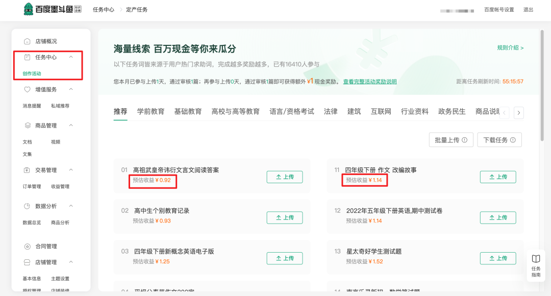点击开店链接可查看审核进度也可在电脑上进入文库的个人中心查看开通店铺后,上架商品、查看收益等操作需要在电脑端进行;你可以通过文库首页进入店铺后台。在店铺后台打开创作活动,看到的就是一条条定产任务了。每条任务下面都有个预估收益,这个是我们上传的文档只需要过审就能获得的收入。每完成一条就会有0.5-3元不等的收入进账。