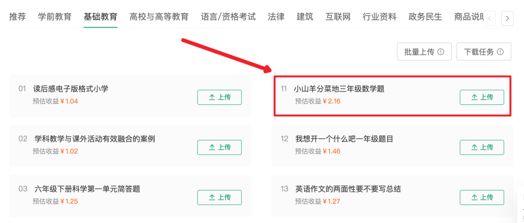比如这个《小山羊分菜地三年级数学题》适合我,我把能找到的资料微调下然后直接传上去,只需通过审核就会有预计2.16元的店铺激励,次月就能到账了。