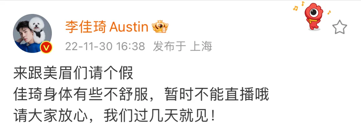 佳琦身体有些不舒服,暂时不能直播哦