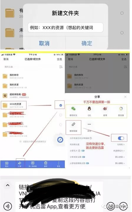 第二步,开好后打开手机迅雷 APP→云盘→右上角+号→选择新建文件夹→文件夹起名→填入关键词命名文件夹→选中刚起的文件夹→点击下面的分享→选择复制链接(不要选择第一排的微信好友那些)→打开下面的允许快速访问分享链接(才会没有提取码)→分享给好友,让好友打开试一下→点链接直接能看到你的网盘文件夹就是完成了。