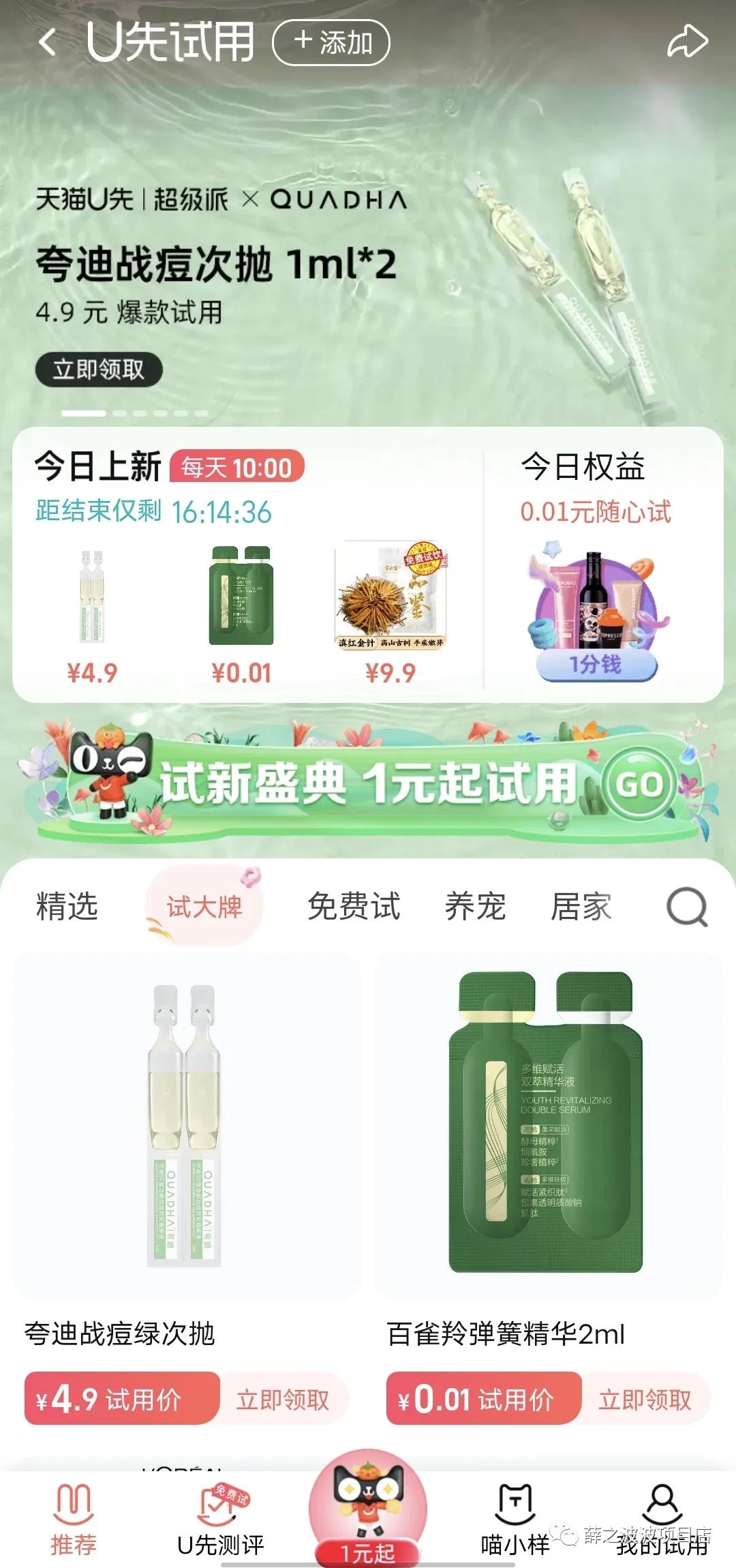 2、天猫U先试用里面购买的活动,这个活动每个号只能用一次,号越多就越能利用这个活动多赚一些。