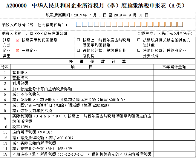第9行=第3+4-5-6-7-8行;如果预缴方式选择“按照上一纳税年度应纳税所得额平均额预缴”的纳税人,第1-8行无需填报,第9行按照上一纳税年度应纳税所得额平均额计算的本年累计金额填报。