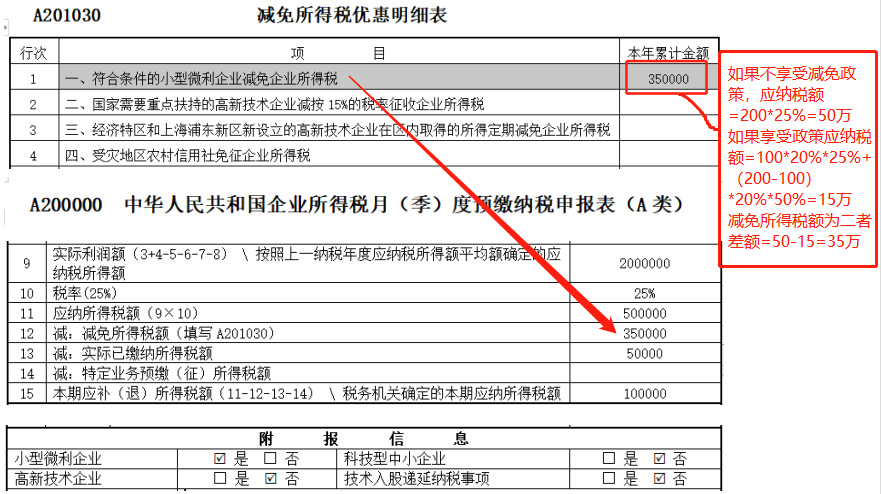 第10-15行是计算本期应缴税额的计算,按实际发生数填列。如果企业享受了税额相关的减免政策,如小微企业、高新企业等,则必须填列附表A201020.