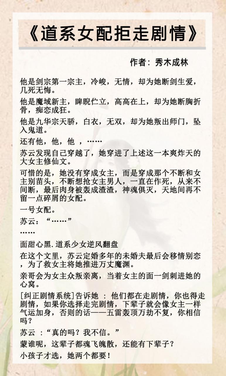 短评:穿书,系统,古言,仙侠,女配逆袭。女主面甜心黑,笑吟吟黑人坑人,机灵诙谐非典型道系少女,穿成大女主修仙文中的一号女配后,拒绝走剧情,逆天改命,疯狂虐渣,推荐阅读。