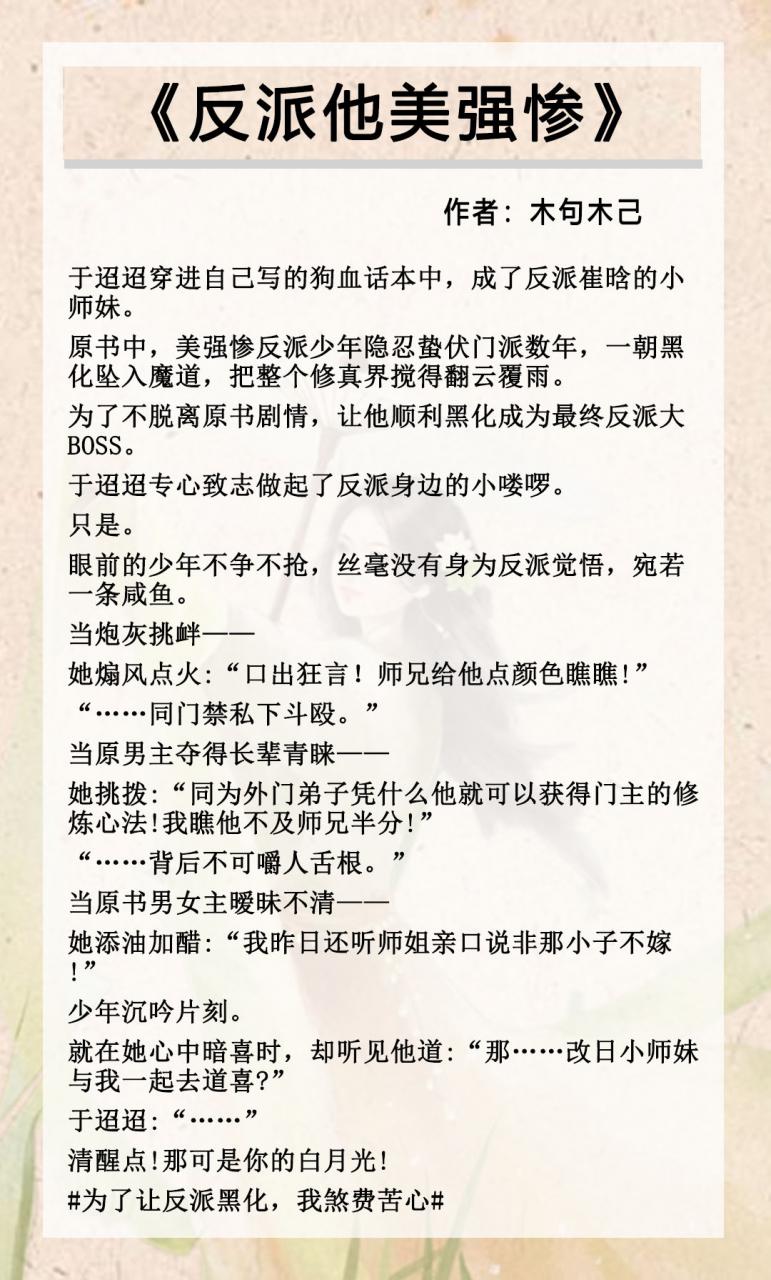 短评:穿书,古言,仙侠,非传统修仙。女主穿进笔下狗血话本中,成了反派的小师妹,为了不脱离原书剧情,女主兢兢业业做男主的狗腿子,各种煽风点火,致力于让男主成功黑化成大反派。