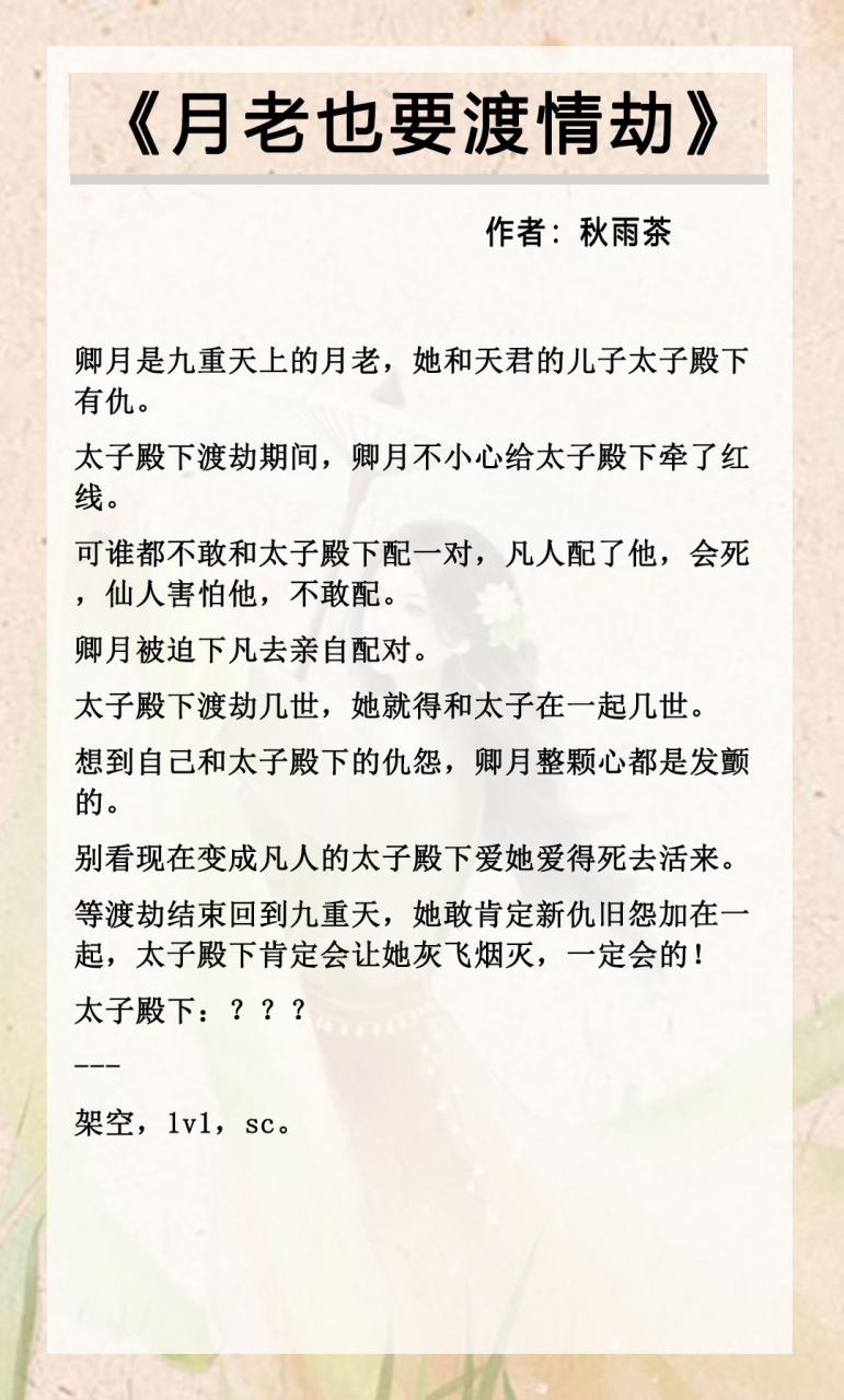 短评:古言,仙侠,1v1,sc。月老女主不小心给下凡渡劫的太子殿下牵了红线,因谁都不敢跟男主配成一对,女主只好硬着头皮亲自配对。