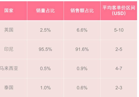 印尼和英国地区数据差距悬殊,无论销售比还是客单价