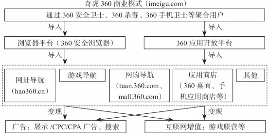 第二层为奇虎360的两大基础平台——浏览器平台与应用开放平台, 奇虎360将核心产品层用户顺势导入这两大平台。