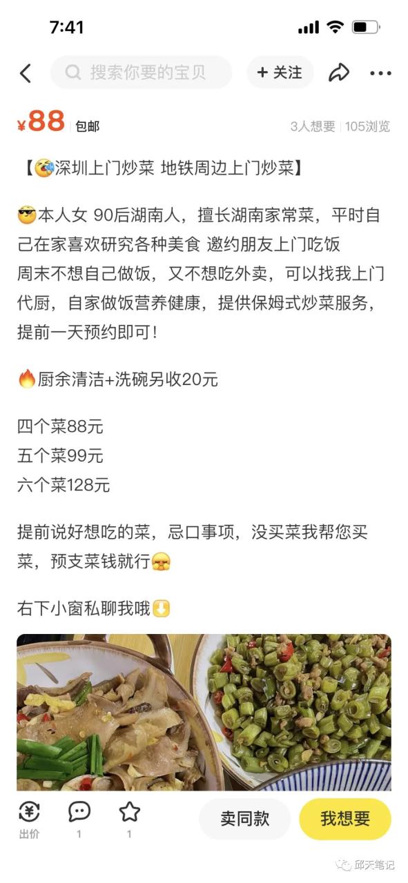 现在城市很多年轻人吃外卖都吃腻了,加上网络平台老是流传外卖不干净之类,加剧排斥外卖,想做饭又没时间,厨艺又不行,都是一堆问题,所以花钱找人做饭,很多人愿意出这个钱的,收费可以按照做几个菜收钱 帮洗碗可以加钱,还可以按长期、短期,这样收费,半个月,一个月,还有其他扩展空间可以挖掘。