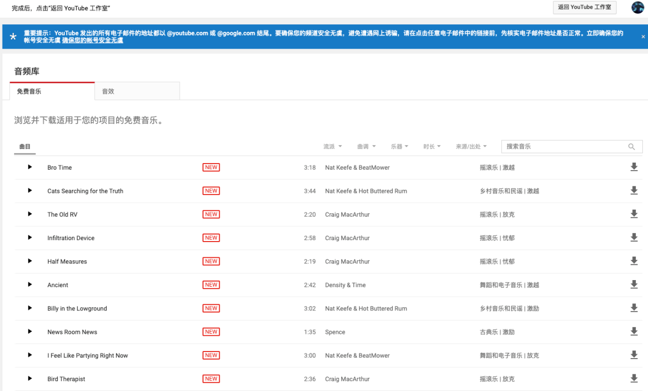 YouTube 免费音乐音效资料库