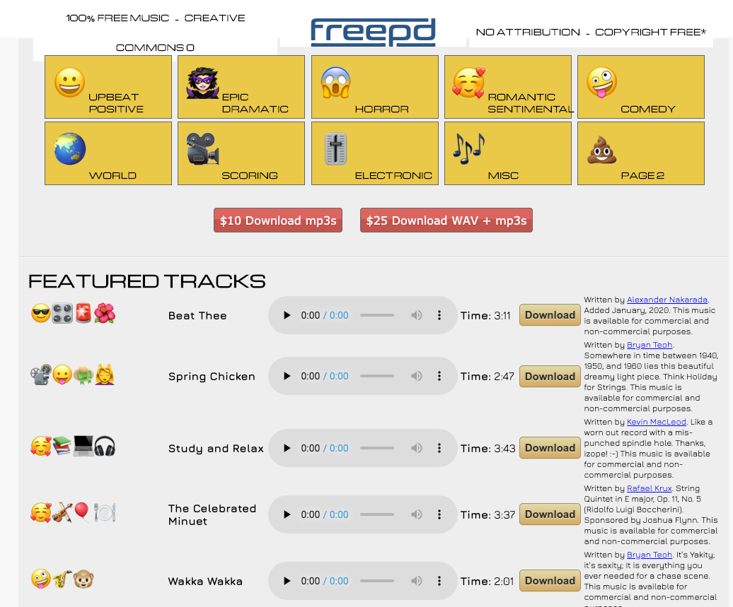 这个网站都不用说了。资料库非常好用,超过1000首背景音乐和环境音效。全部免费可商用,注意有些素材使用时需要“加上作者”才能使用。