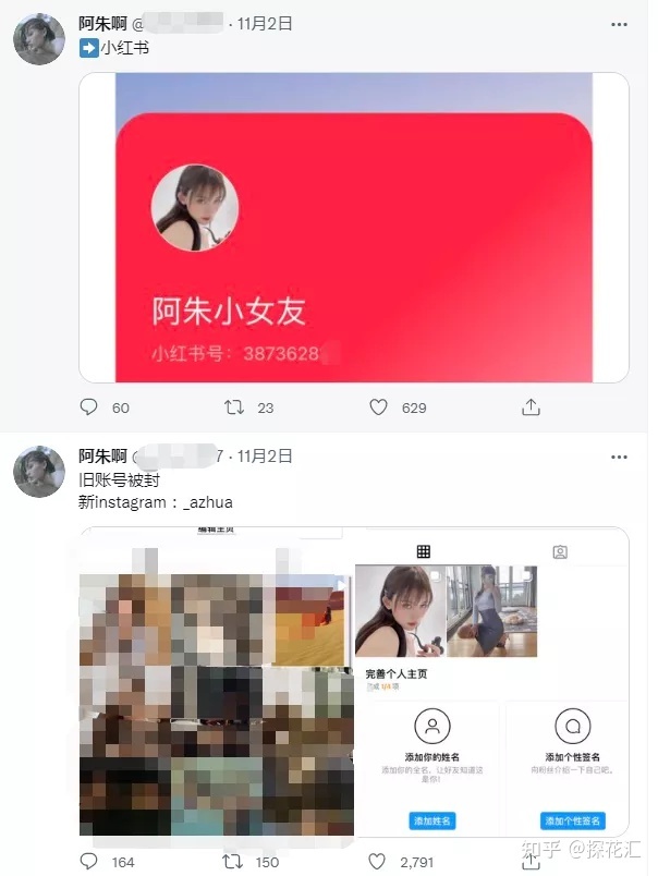 不过大家都以为阿朱被抓的时候,她的推特突然在11月2号更新了,她的小红书和ins被封发布了新的帐号,好像阿朱要改邪归正转战国内的平台了。