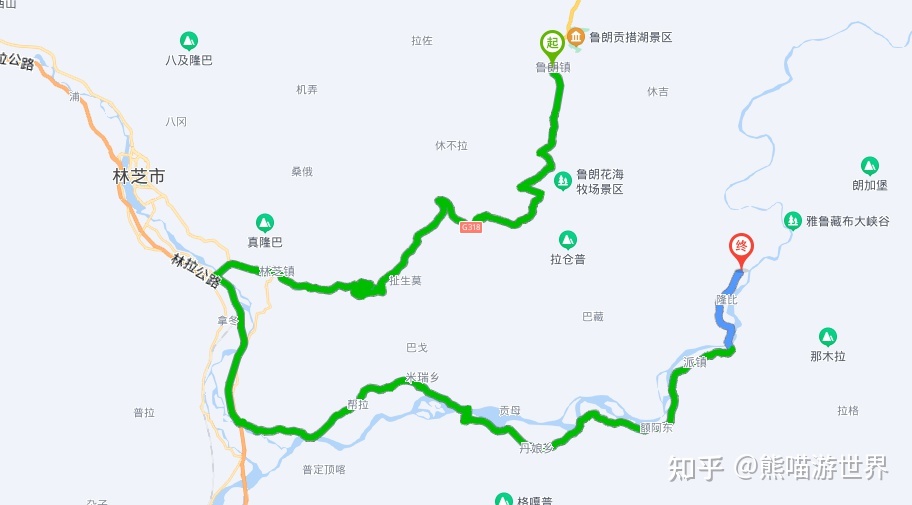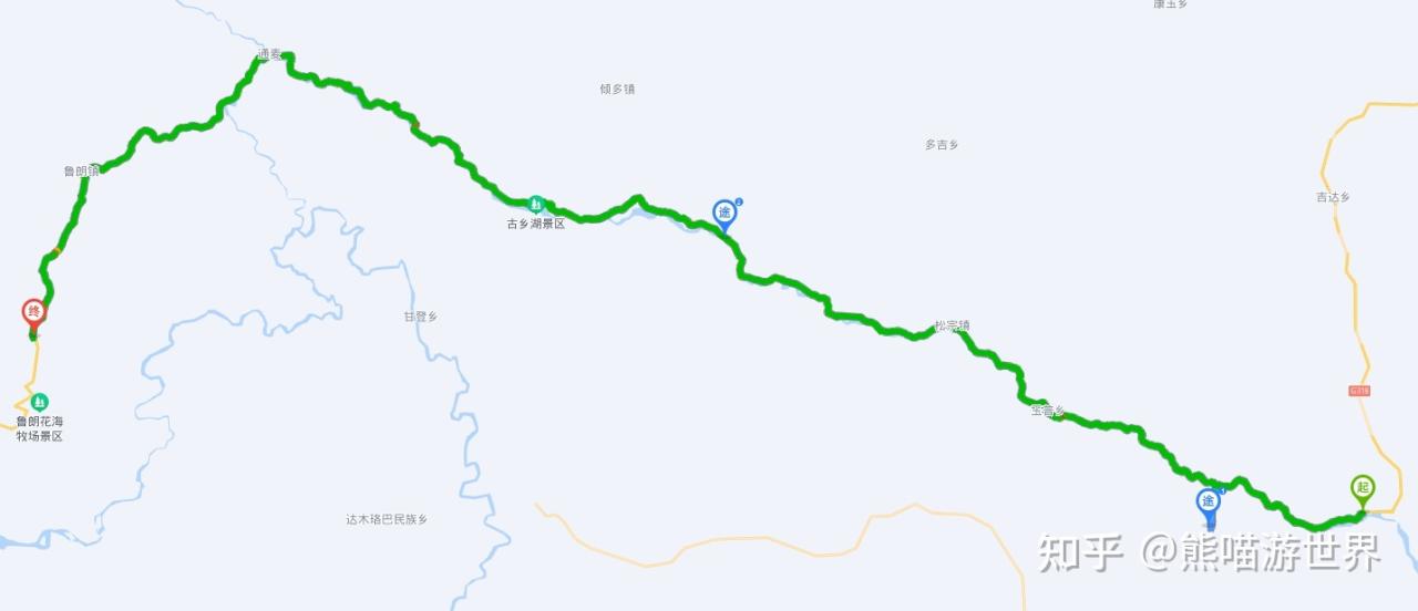 从古乡湖出发,经过通麦大桥,过通麦1号隧道,经过排龙迫龙沟特大桥后。后抵达【鲁朗镇】。