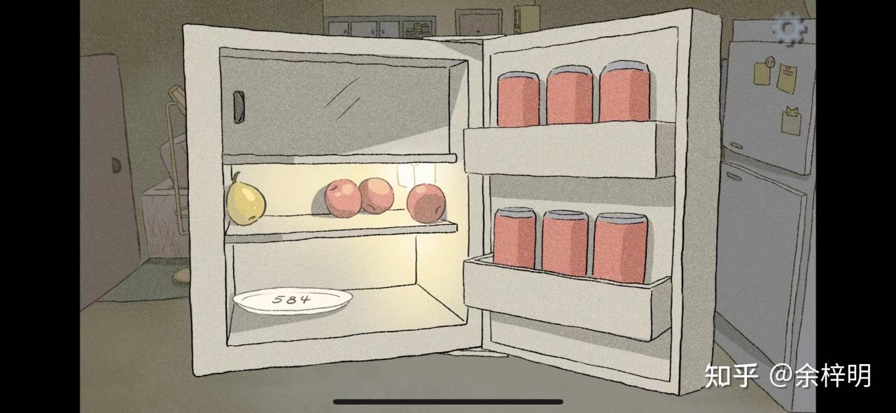 第一个密码在冰箱中,找到一个圆形的盘子,上面写着584,对应圆形的密码
