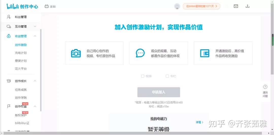 可能有人搞不明白这个电磁力等级是什么,它就是对UP主在B站投稿活跃行为的一个评判,你越活跃等级就越高。这玩意对精心制作视频的UP主来说并不友好,以前可能一个视频就出10W+然后开通创作激励,现在你就算视频出了10W+,还得把活跃等级提上去才能开,资本家的嘴脸,唉。我玩的比较早,那时候是一万播放量30元左右,现在应该没有这么高了,不过在自媒体平台中,B站的播放量依旧是单价最高的。