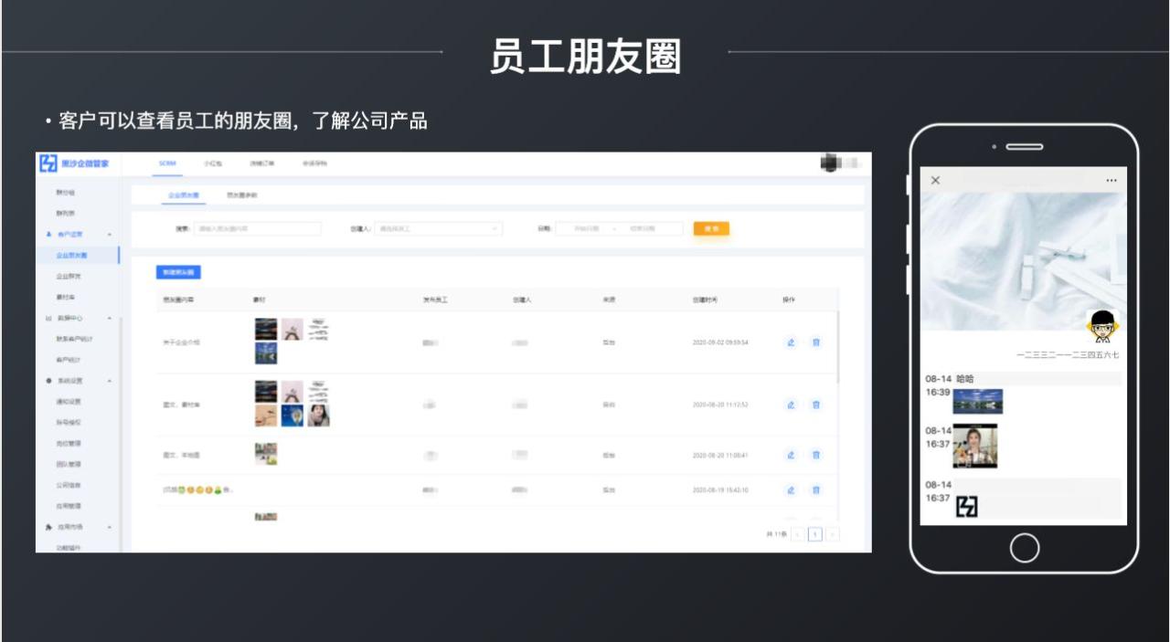 (2)企业微信可以给微信客户发送朋友圈。发布朋友圈触达客户是通过企业微信号窗口发送,以用户接收为准。个人号发朋友圈,每日可接收1次;企业发朋友圈,每月可接收4次。(黑沙企微管家在此基础上开发出可自定义的历史朋友圈功能,显示在个人资料入口中,发布不受限制。)