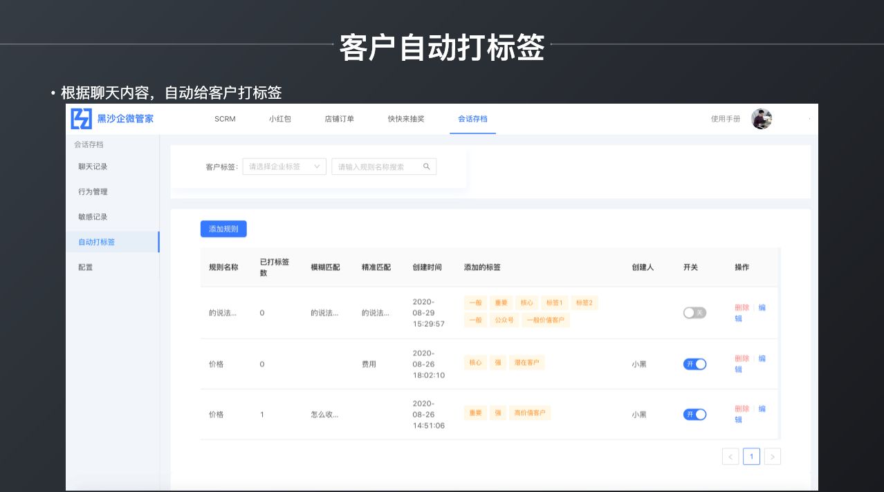 且支持自动关联企业微信标签打标功能,极大提升运营人员进行标签维护的效率。如果企业本身就拥有极为庞大的销售或客服团队,那么使用企业微信结合黑沙企微管家为客户提供服务是再适合不过了,让流水的员工用铁打的账号,保护企业的数字资产。