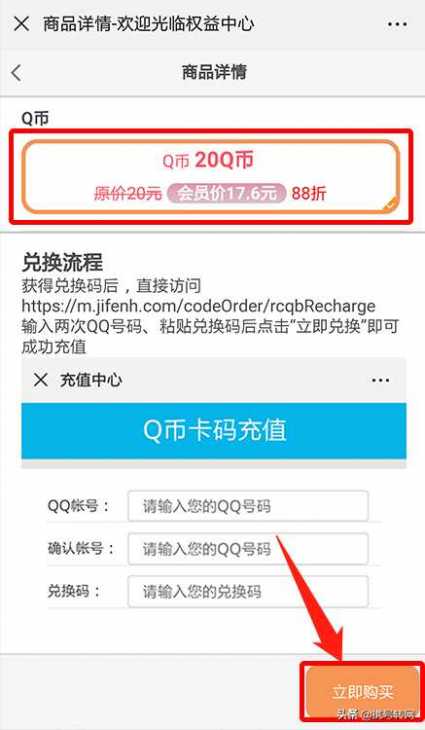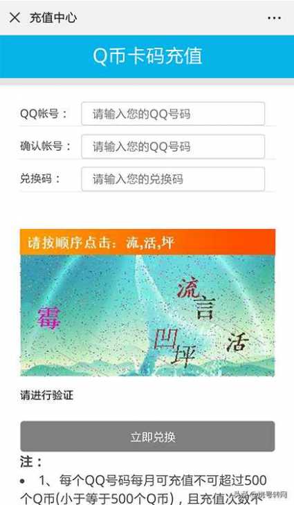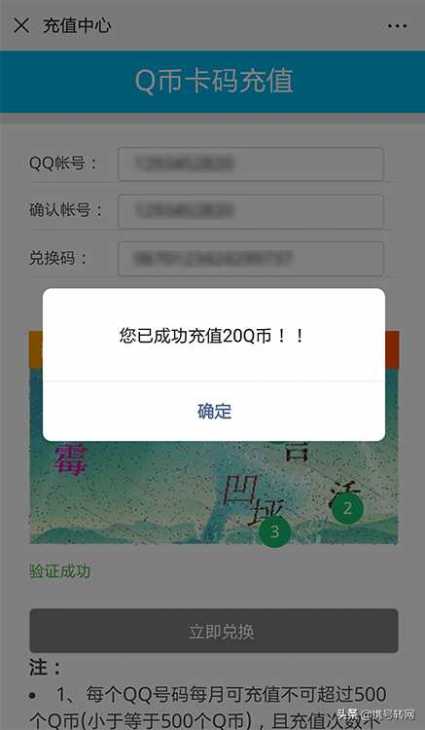 输入两次QQ号码、粘贴兑换码后点击“立即兑换”即可成功充值