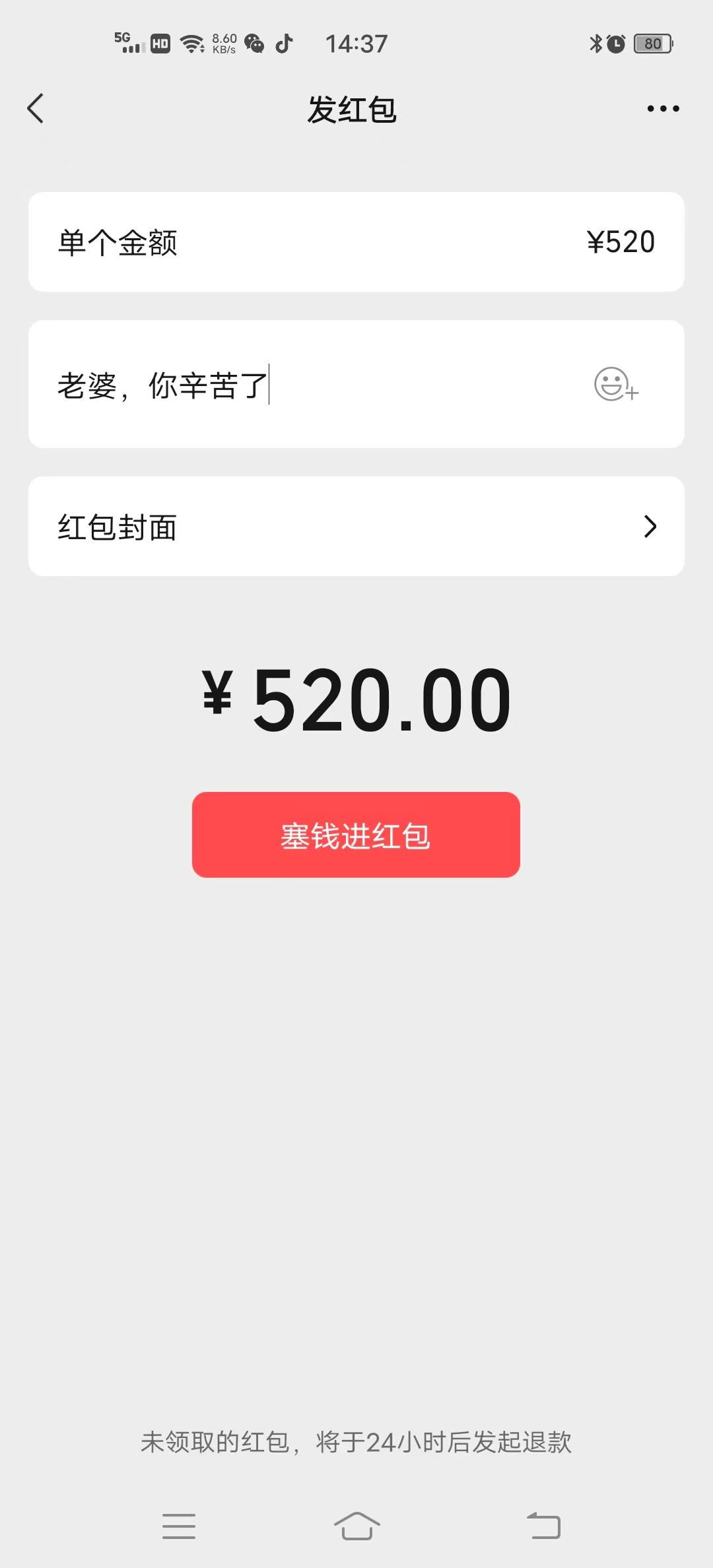 因此,小编测试了一下,发了一个大红包给自己的老婆,用这种方式表达出我的感激和爱意。希望大家也能在这个特殊的日子里找到属于自己的另一半,享受发红包的快感,尽情地分享幸福和爱。