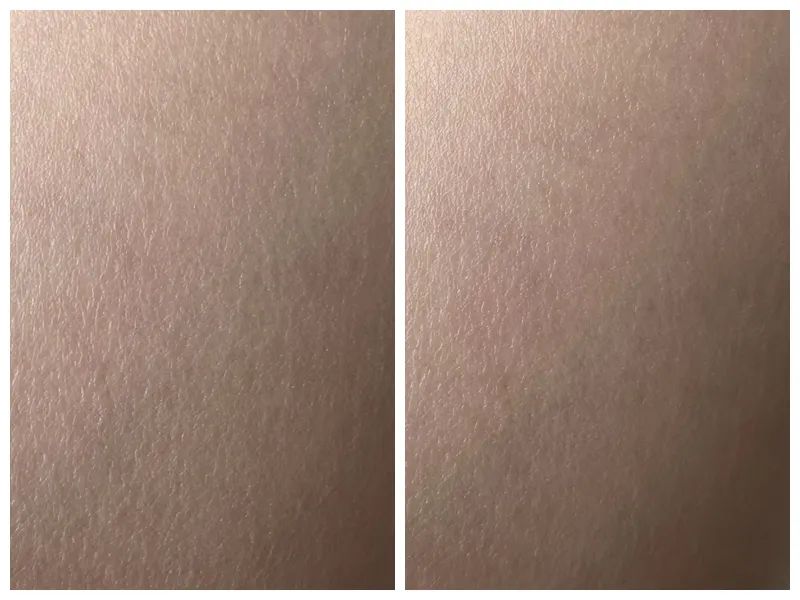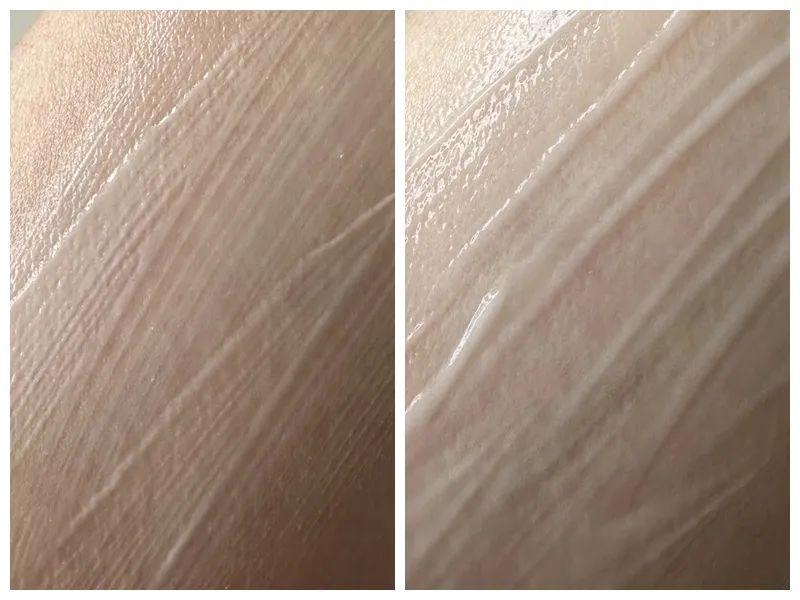 这个也是左边是滋润版,右边是轻盈版,发现没有?轻盈版的擦上,皮肤纹理会更淡一些,咱也不知道因为啥。但是我实际使用下来,情况就是这么个情况。