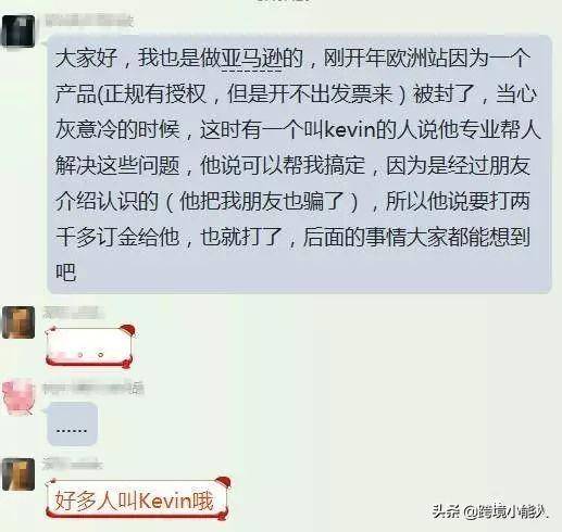 被骗者自述:大家好,我也是做亚马逊的,刚开年欧洲站因为一个产品(正规有授权,但是开不出发票来)被封了,当心灰意冷的时候,有一个叫kevin的人说他专业帮人解决这些问题,他说可以帮我搞定,因为是经过朋友介绍认识的(他把我朋友也骗了),所以他说要打两千多订金给他,我也就打了,后面的事情大家都能想到吧……