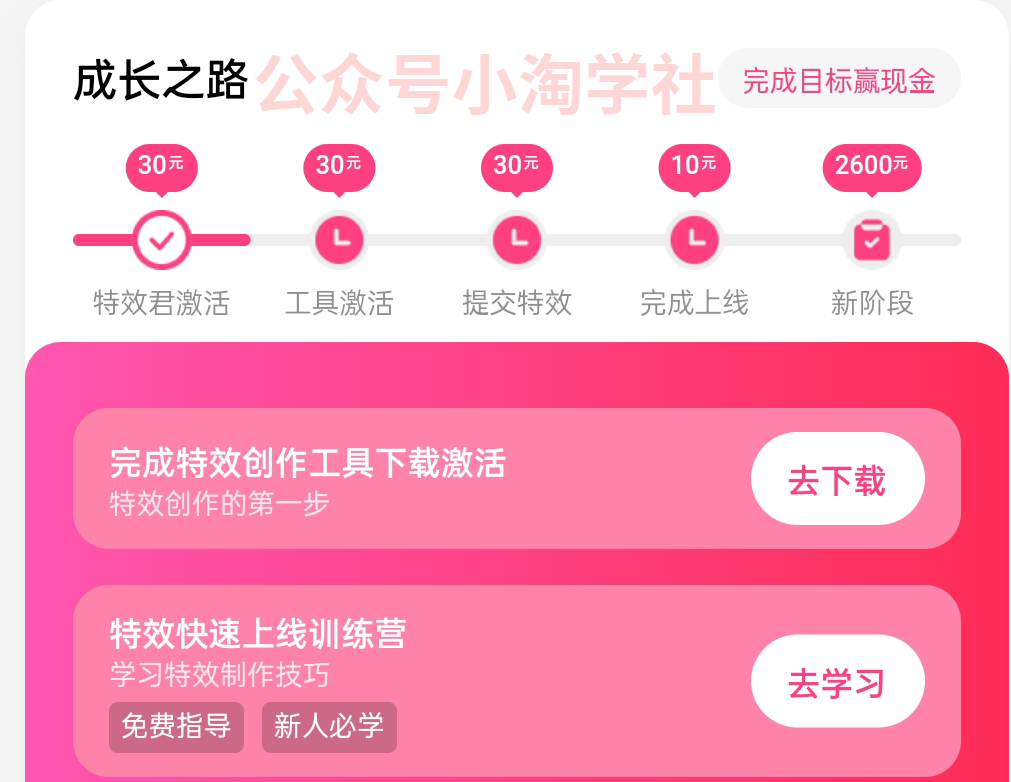 可以看到成长之路,直接登录这个特效君APP就完成第一项“特效君激活”了,不过这个30元是提不了的,必须按照他的这个指引成功到“完成上线”才能提现100元。