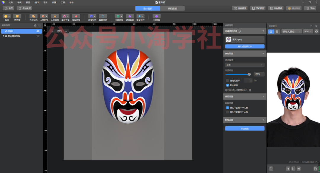 我们直接把面具素材拖进软件里,蒙上预览人物的脸,对好位置就能直接去提交特效了,这里又有一个问题,那就是这个面具的素材是怎么做出来的,其实这个面具我也画不出来,说了我也只有半桶水,和大家一样只会打开软件去上传这些基本操作,要我画图或者搞设计我真不会。