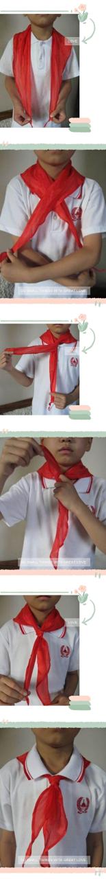 它代表红旗的一角,是革命先烈的鲜血染成。每个队员都应该佩戴它和爱护它,为它增添新的荣誉。