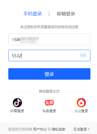 建议使用手机号接收验证码进行登录,不要使用抖音、头条或者火山登录