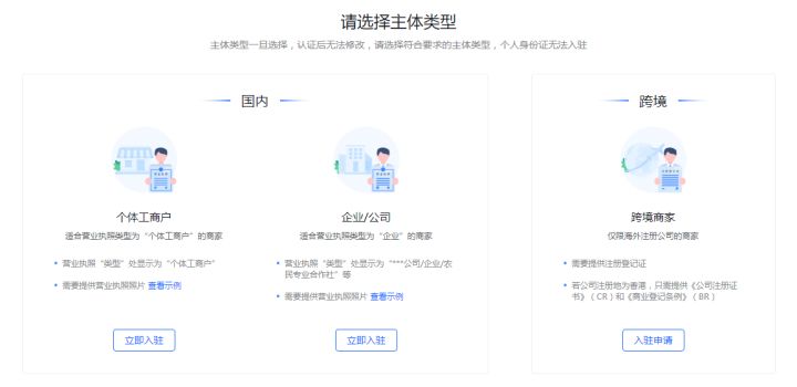 国内用户可选择个体工商户、企业/公司,跨境用户选择跨境商家。