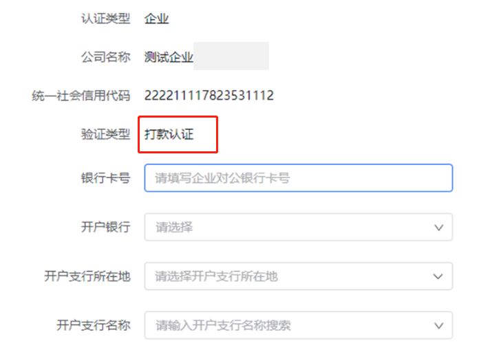 资料审核完成后,进行账户验证阶段。目前支持两种验证方式:实名认证与打款认证。