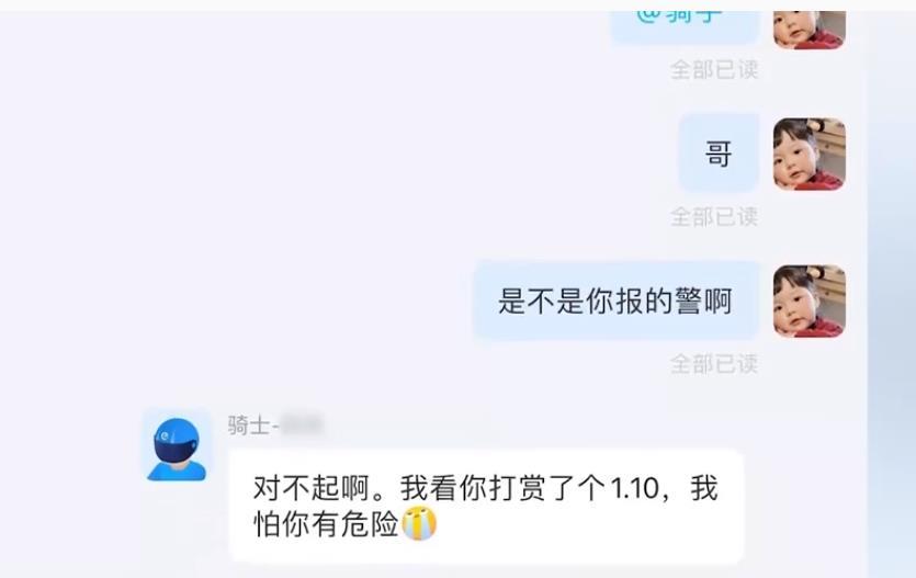 因为余额里只剩两元钱。就随手输了1.1元打赏给外卖小哥。没想到几分钟后,小区物业和民警敲门询问是否遇到危险。唐女士不知所以,民警告诉他,是外卖小哥报的警。外卖小哥收到1.1元打赏。联想到110,以为陶女士遇到危险,赶紧报警,原来闹了个大乌龙。只要哥进一步解释到,一般人打赏从来都是整数,1.1元给外卖员打赏有点特殊,以为陶女士女生遇到危险,才贸然选择报警。