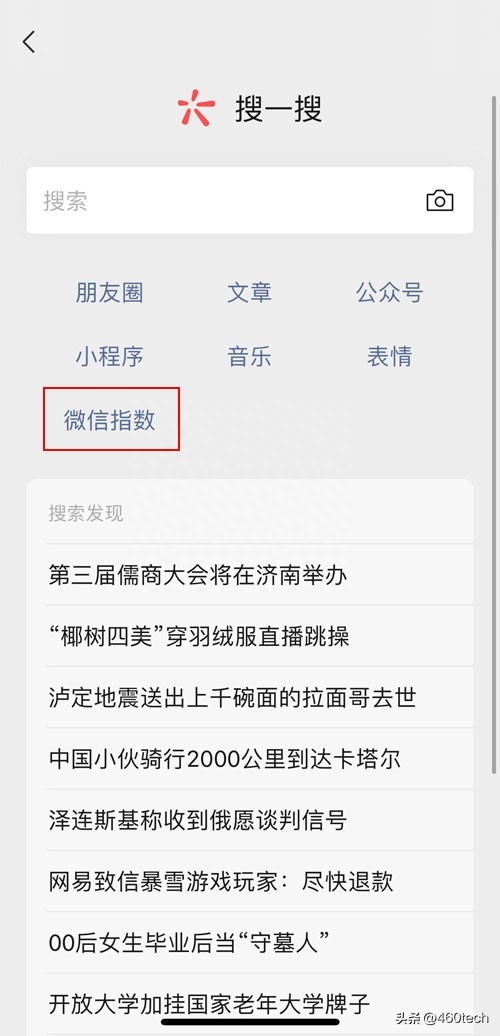 2、进入【搜一搜】后,在搜索下方,就可以看到【微信指数】按钮了,点击进入;