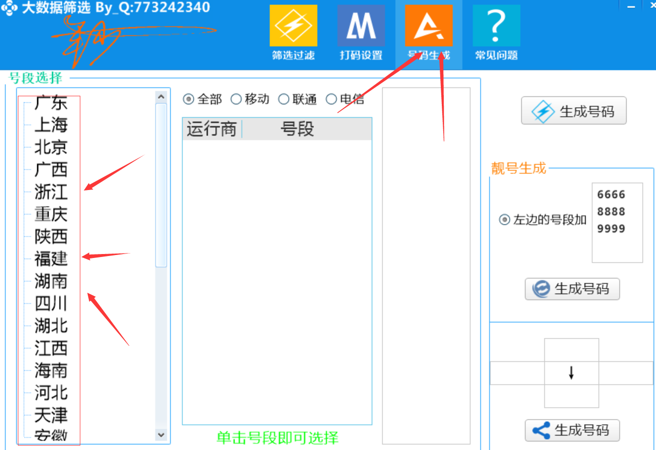 本软件采用的是无偿提供、付费使用的方式,10元可以生成4000个靓号,可以选择不同地区、运行商和尾号号码段。