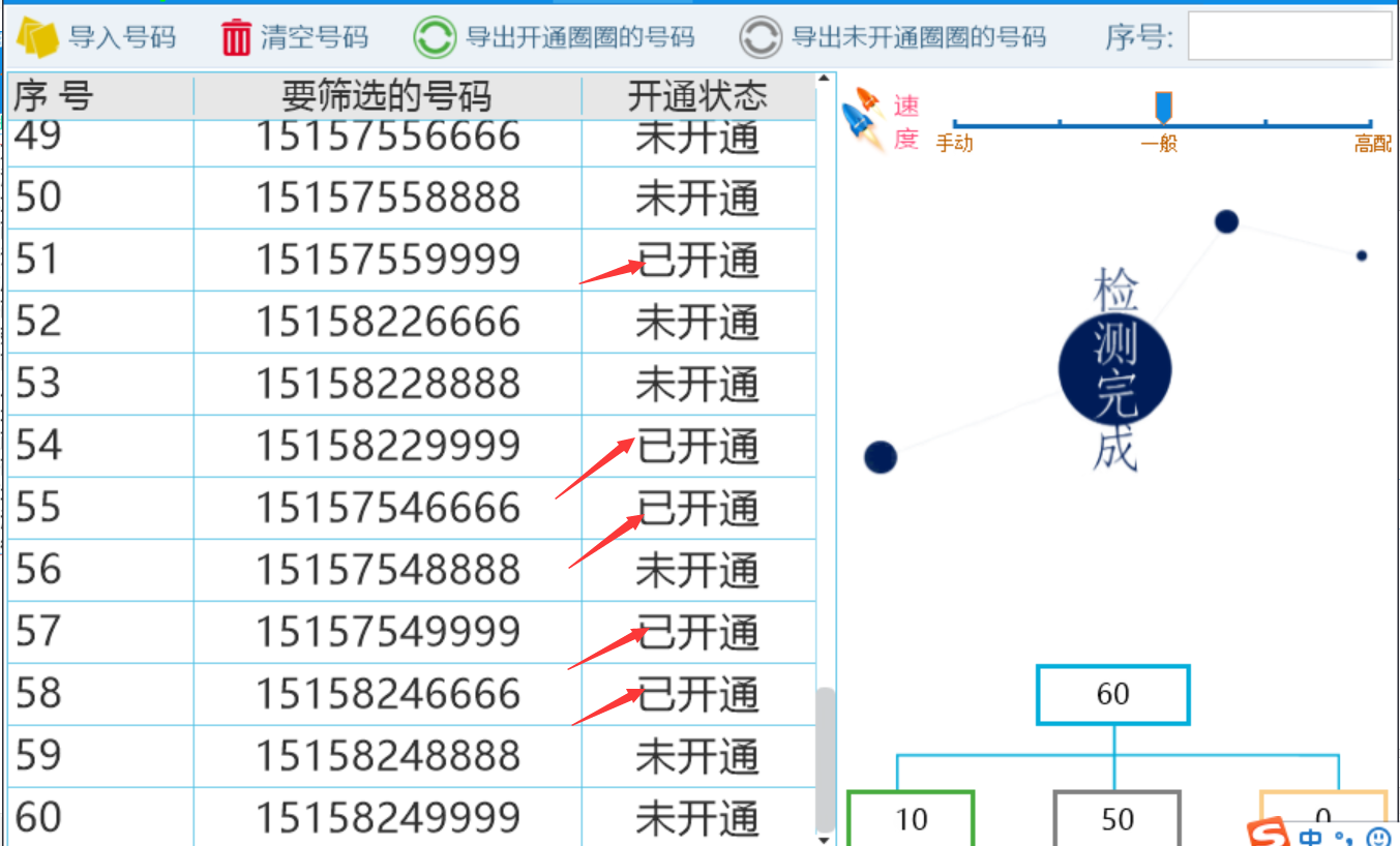 生成的手机号码会显示是否开通微信,选择已开通微信的号码进入自己的数据库备用。