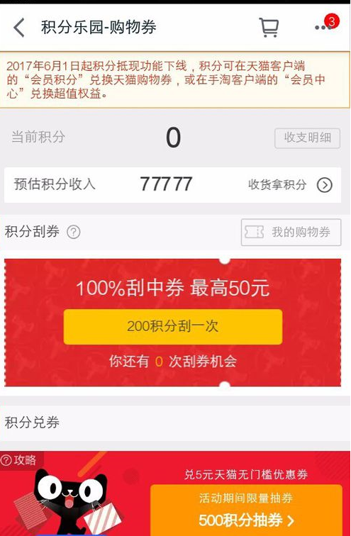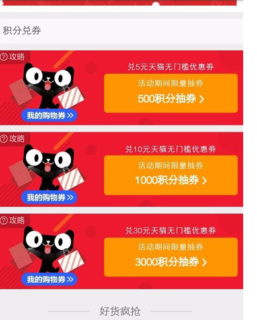 这样可以更直观的看到我们的天猫积分有多少,往下滑动有个积分兑券,有500积分,1000积分,3000积分,三个选项。选择你要兑换的积分券。