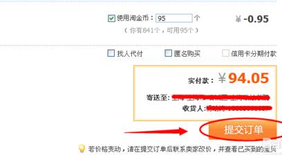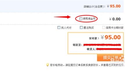 4.输入使用多少个淘金币,100个淘金币等于一块钱。然后点击提交订单